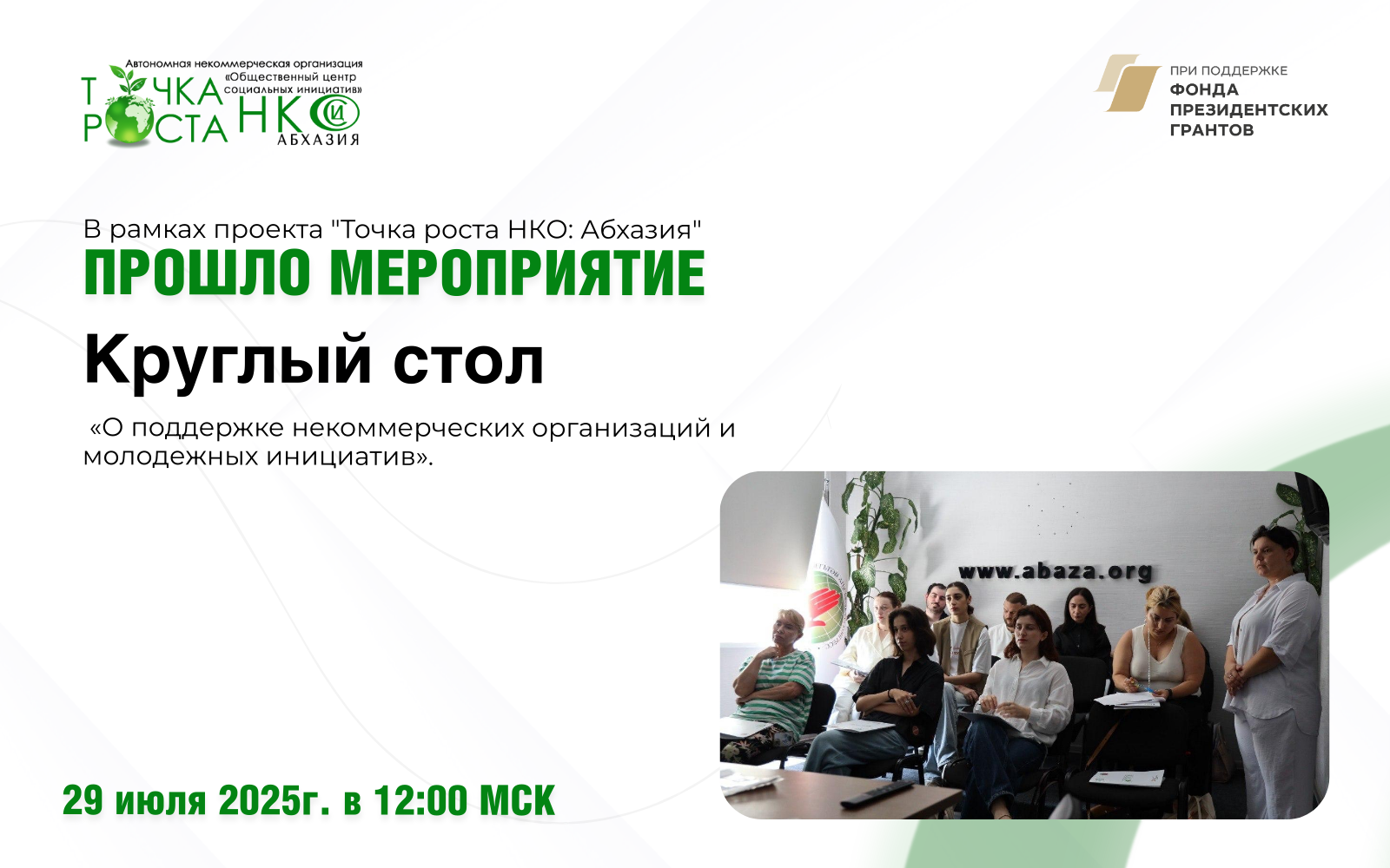 Хотим поделиться с вами результатами нашего мероприятия «Круглый стол», который мы провели совместно с нашими партнерами общественной организацией «Всемирный абхазо-абазинский конгресс» для некоммерческих организаций Республики Абхазия в рамках проекта «Точка роста НКО: Абхазия», поддержанного Фондом президентских грантов.нтов.