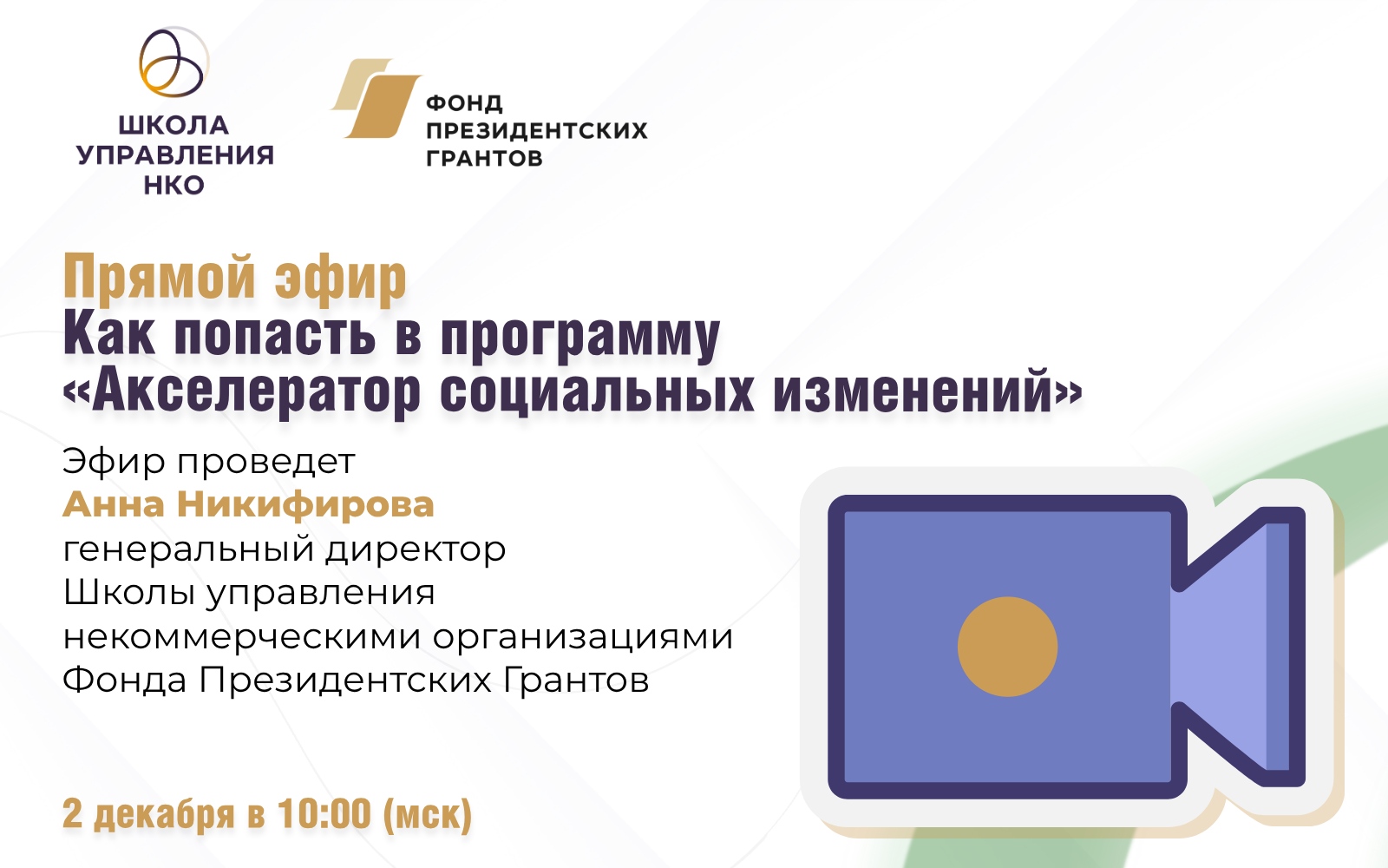 Приглашаем вас на прямой эфир о программе Фонда президентских грантов «Акселератор социальных изменений», который состоится 2 декабря в 10:00 по московскому времени.