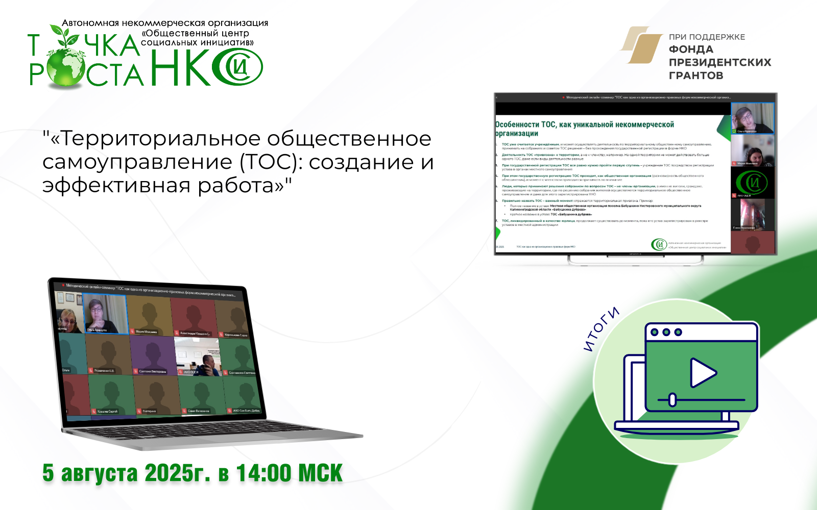 5 августа мы провели методический онлайн-семинар на тему: «Территориальное общественное самоуправление (ТОС): создание и эффективная работа».