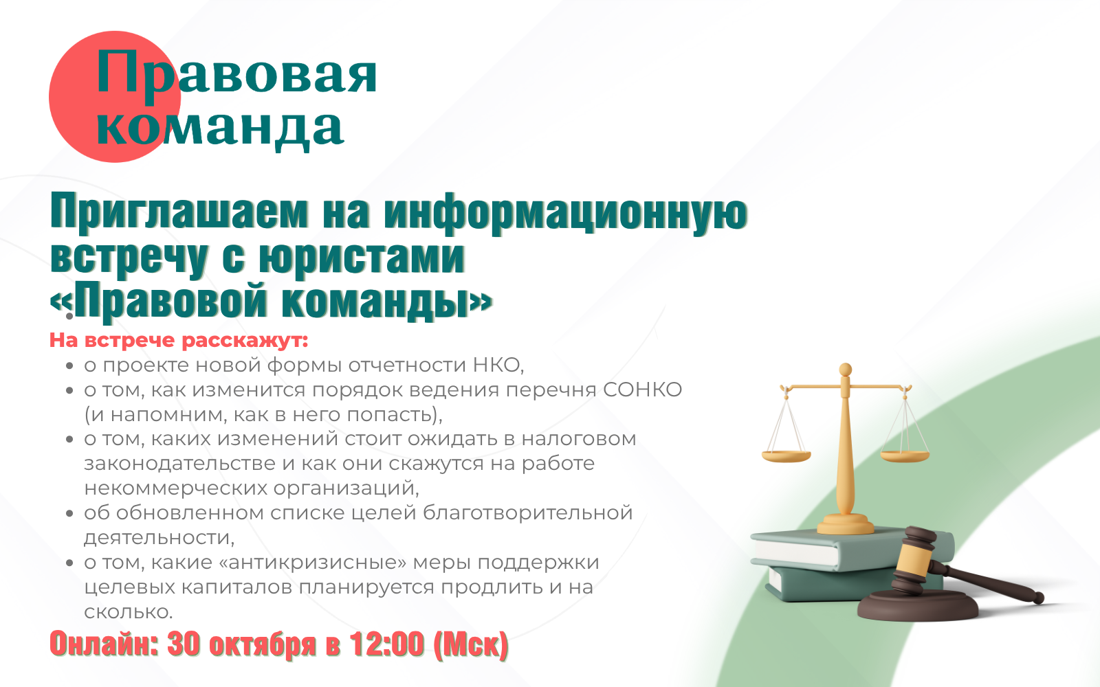 Приглашаем представителей некоммерческих организаций на традиционную ежемесячную информационную встречу с юристами «Правовой команды», которая состоится 30 октября в 12:00 (Мск) в онлайн-формате.