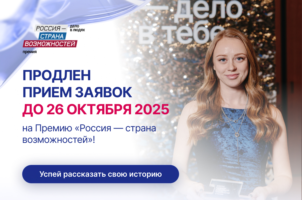 Уважаемые коллеги! ✨ Прием заявок на премию «Россия — страна возможностей» продлен до 26 октября 2025 года.