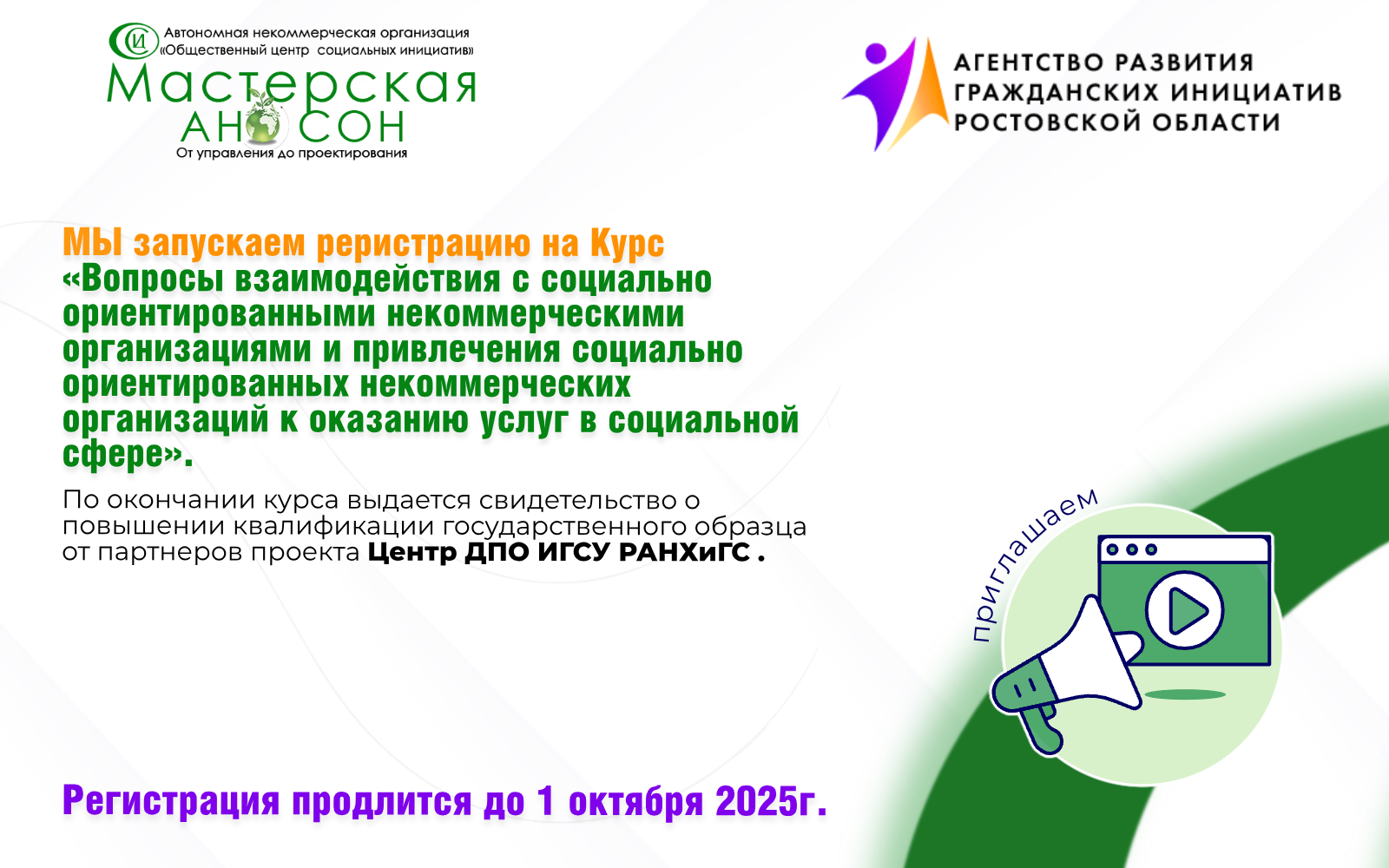 Дорогие коллеги, рады анонсировать наш новый проект Мастерская "АНО СОН: "От управления до проектирования", в рамках реализации которого мы запустим Курс «Вопросы взаимодействия с социально ориентированными некоммерческими организациями и привлечения социально ориентированных некоммерческих организаций к оказанию услуг в социальной сфере».