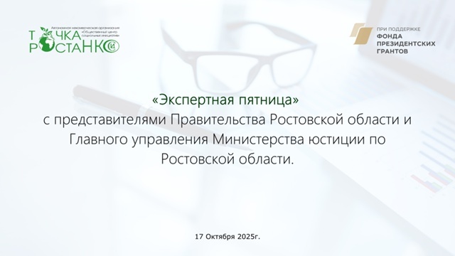 17 октября, состоялась уже ставшая традиционной «Экспертная пятница» в онлайн формате, на этот раз она проводилась с представителями Главного управления Министерства юстиции по Ростовской области. Модерировала мероприятие менеджер программ проекта Мария Моисеева