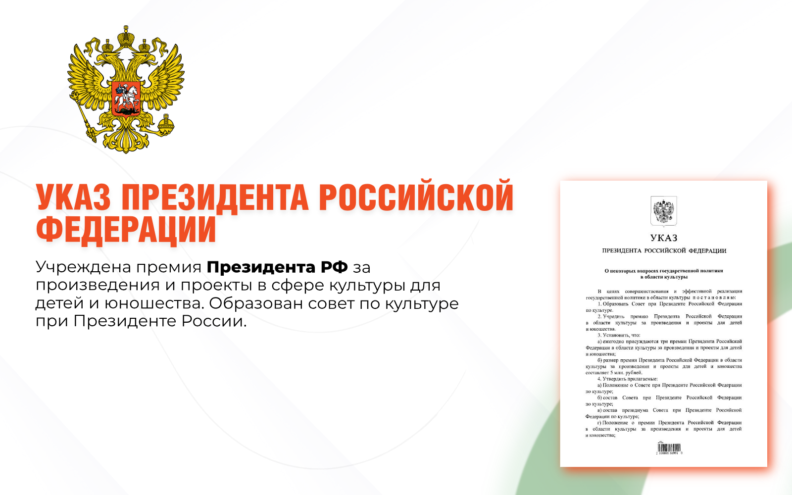 Уважаемые коллеги! Приятные новости из сферы культуры и образования. Президентом Российской Федерации учреждена специальная премия в области культуры за произведения и проекты для детей и юношества.